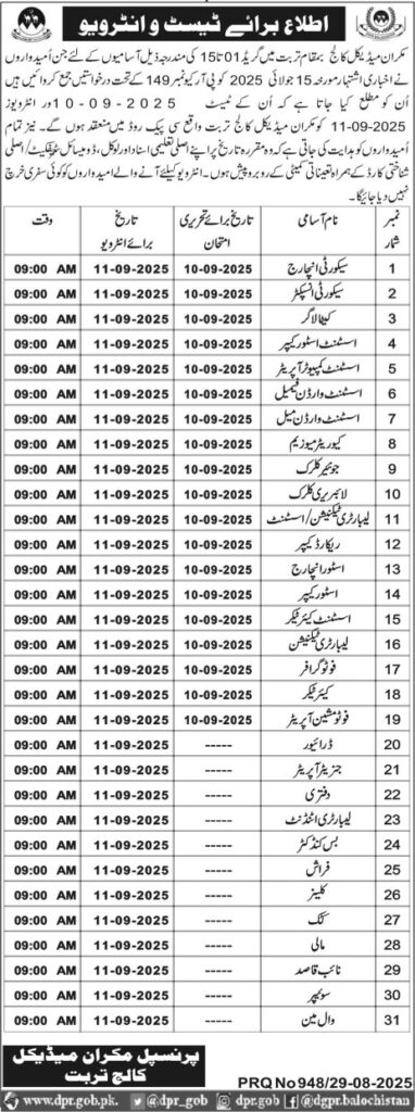 Makran Medical College in Turbat, Balochistan, has officially opened a range of employment opportunities, as detailed in the advertisement published on August 30, 2025. These roles fall under the category of management and administrative services, with full-time positions available across multiple departments. Prospective candidates are encouraged to act promptly, as the selection process favors early applicants—those applying within the first 25 submissions may receive priority consideration. The listed job openings span a broad spectrum, including but not limited to positions such as store manager, assistant caretaker, janitorial staff, clerical workers, gardeners, and transportation support staff. Applicants with educational backgrounds ranging from Primary school certification to Bachelor’s degrees are eligible, with varying levels of academic qualifications given preference based on the position’s nature and responsibilities.
